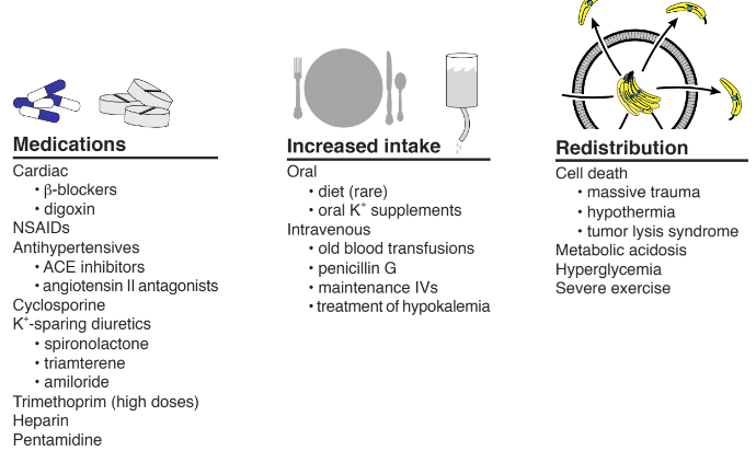 - Decreased excretion: AKI/CKD, hypOaldosteronism, volume depletion, type 4 RTA